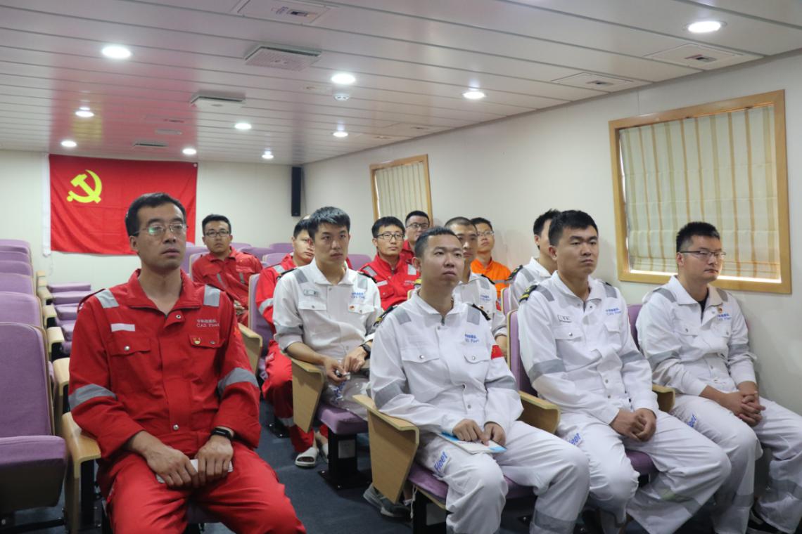 临时党支部全体党员及入党积极分子共同观看了《战“疫”一线党旗红》专题片,学习了疫情爆发以来各级党组织如何贯彻落实党中央关于疫情防控的工作部署,积极主动履职,快速跟进响应,充分发挥基层党组织战斗堡垒作用和党员先锋模范作用的先进事迹。临时党支部书记宋永东要求支部党员向抗疫一线先进党员学习,结合航次具体工作,牢记使命重托,扎根一线,用严谨的科学精神,勤奋的工作态度,认真履职担责,圆满完成航次任务。
