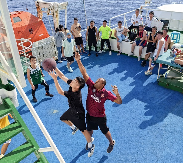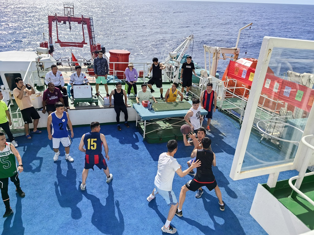 为增进“科学”轮船员和课题组之间的融合、促进国际交流、丰富海上生活,响应海洋所篮球赛,10月11日,“科学”轮在航渡期间组织举办了“科学”轮2304航次海上篮球赛。