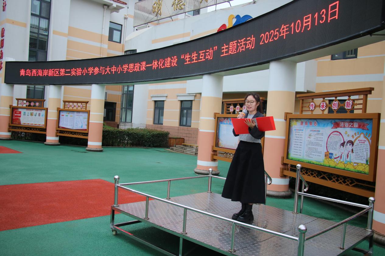 2025年10月13日,中国科学院海洋研究所学生党支部的12名学生党员走进青岛西海岸新区第二实验小学,与全体师生共同举行“生生互动”主题升旗仪式,并带来首场“海洋自然公开课”。活动以生动的形式推动了思政教育与科学启蒙的深度融合。